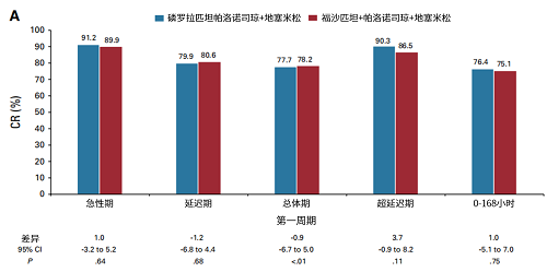 研究达到主要终点(第一周期总体期的CR率分别为77.7% vs 78.2%[95% CI:-6.7,5.0];单侧P<0.01)(图1)。连续两个化疗周期,磷罗拉匹坦帕洛诺司琼急性期和超延迟期的CR率均达到90%以上,高于FAPR+PALO,且第二周期疗效更佳(急性期:第一周期:91.2% vs. 89.9%,第二周期:93.3% vs. 91.1%;超延迟期:第一周期:90.3% vs 86.5%,第二周期:92.7% vs 87.8%)(图2、图3)。