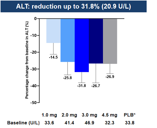 32周后,HRS9531各剂量组中最高降低丙氨酸氨基转移酶转氨酶(ALT)31.8%、天门冬氨酸转移酶(AST)23.5%(图4)。HRS9531各剂量组对尿白蛋白/肌酐比值(UACR)的降低作用呈现剂量依赖性。治疗32周后,HRS9531 4.5 mg组UACR降幅可达61.8%(图5)。