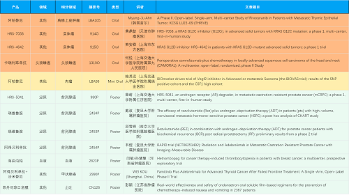 在胸腺上皮肿瘤、头颈鳞癌、肉瘤、前列腺癌、甲状腺癌等其他多个疾病领域,卡瑞利珠单抗、阿帕替尼、瑞维鲁胺、阿得贝利单抗、法米替尼、HRS-7058、HRS-4642、HRS-5041等抗肿瘤创新药相关研究一共入选了4项口头报告、1项简短口头报告、5项壁报,彰显了ks凯时强大的研发实力。此外,海曲泊帕和昂丹司琼口溶膜分别在防治化疗导致的血小板减少和恶心呕吐方面各有1项研究入选壁报。