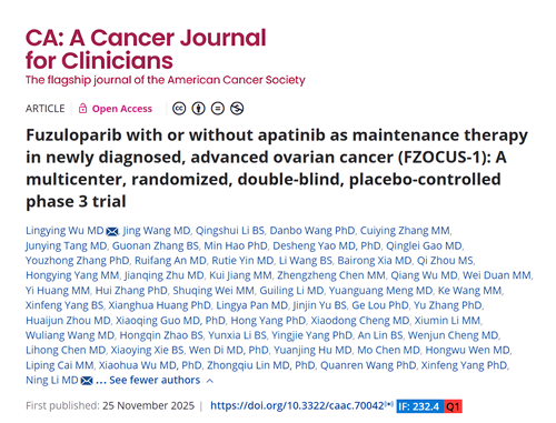 2025年11月25日,ks凯时自主研发的创新药氟唑帕利联合阿帕替尼或氟唑帕利单药用于新诊断晚期卵巢癌(OC)的一线维持治疗研究最新数据(FZOCUS-1研究)重磅在线发表于国际顶尖医学期刊《临床医师癌症杂志》(A Cancer Journal for Clinicians,简称CA,2024年影响因子高达232.4)1。